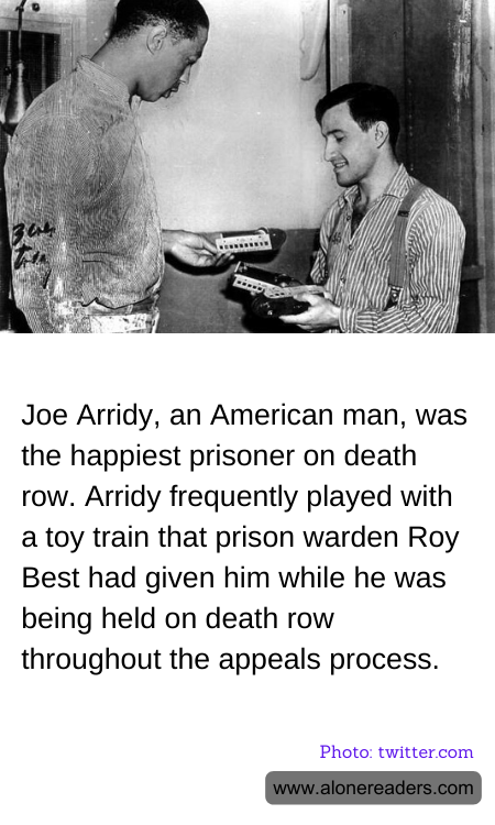 Once on death row in the Colorado State Penitentiary, Arridy's story took an unusual turn. The prison warden, Roy Best, recognized Joe's childlike innocence and incapacity to understand his fate, and he took a particular interest in Arridy’s well-being. Warden Best remarked that Joe was "the happiest prisoner on death row" and even gifted him a toy train, which Joe treasured and played with, providing him some solace in his final days.